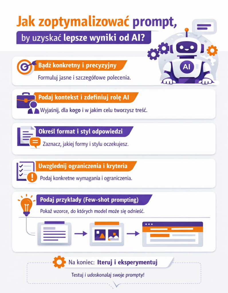 Istnieje zestaw uniwersalnych zasad i dobrych praktyk, które pomogą Ci pisać lepsze prompty i unikać typowych błędów. Optymalizacja promptu to często iteracyjny proces – warto zaczynać od jasnego sformułowania, a następnie doszlifowywać na podstawie odpowiedzi modelu.
